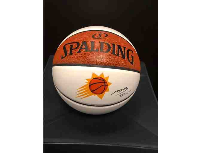 Bid now to win this Spalding basketball autographed by Suns guard Mikal Bridges. The basketball is leather with white signature panels and the Suns logo.
