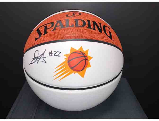Bid now to win this Spalding basketball autographed by Suns center DeAndre Ayton. The basketball is leather with white signature panels and the Suns logo.