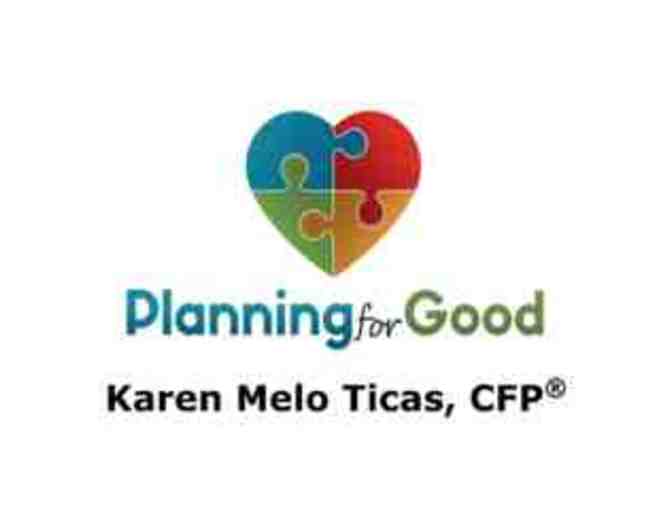 Special Instructions: Implementation of recommendations can be done with the company of your choosing and may result in fees and/or commissions separate from this analysis. This offer is not available to current or past Planning for Good or Baystate Financial clients. Meetings will be held via web conferencing. Recipient must contact us directly to book an appointment. Your analysis is to be completed within one year of the charity event for which this was donated. Securities, investment advisory and financial planning services are offered through qualified registered representatives of MML Investors Services, LLC. Member SIPC. Mailing address: 501 Wampanoag Trail, #200, E. Providence, RI 02915. Planning for Good® and the puzzle heart logo are registered trademarks. Copyright © 2019 by Karen Melo Ticas, CFP®, RICP®. All rights reserved. CRN202203-262140