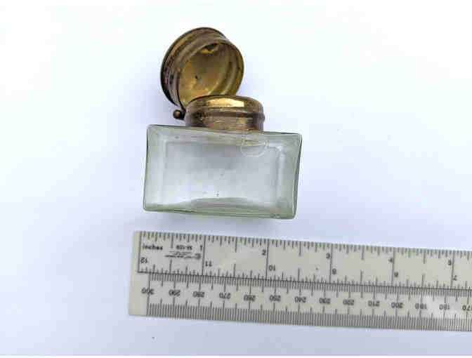 The vintage ink well is about 2" high and the base is about 1 3/4" x 1 3/4". The base is glass and the top appears to be brass.