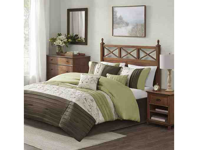 The top of the comforter is a mix of green, chocolate brown, and taupe with piecing details while the taupe section has an embroidered floral pattern for a soft divide from these bold colors. Made from polyester dupioni, this fabric will produce a shine and pick up the light on both the comforter and shams.