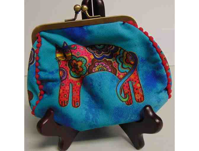 This 6"wx4 1/2" Laurel Burch purse for make-up or coin and credit card purse. Donated by Teresa Hasty.