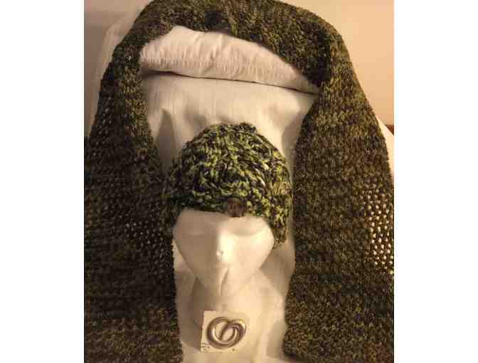 Brown weave alpaca, merino wool, and acrylic scarf with hat and pin