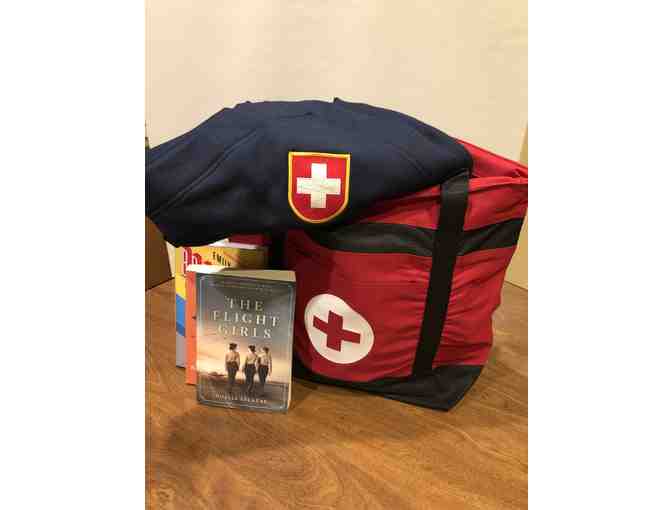 Insulated red canvas bag (23x18x7) holds your navy blue embroidered lap blanket (50x60 poly/cotton), embroidered with the Swiss shield.