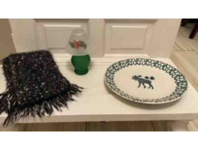 Very nice handwoven scarf 5.5'; 12" reindeer Christmas plate; and a tea light lamp in this holiday set.
