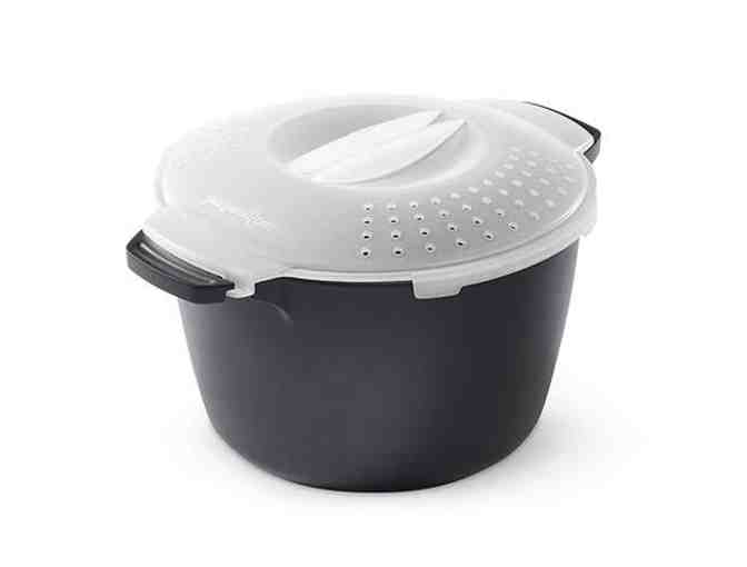 2 Quart capacity for family size side dishes. Perfect for steaming those fresh veggies from your garden or the farmers market. Use to cook rice, grains or potatoes. The frosted lid lets you see when liquids begin to boil. The lid has holes that let steam escape and help you drain liquid before serving. Plus, it locks into place so it stays secure as you drain. Dishwasher safe.