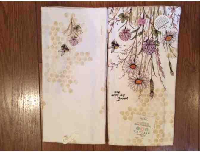 These terry kitchen towels will make a wonderful addition to your kitchen decor. Each measures 16 inches by 26 inches. 100% Cotton. 2 in 1 Functionality! Classic flat tea towel surface is ideal for drying glassware and reverses to absorbent terry cloth for everyday kitchen tasks! Pictures are of the front and back of towel.