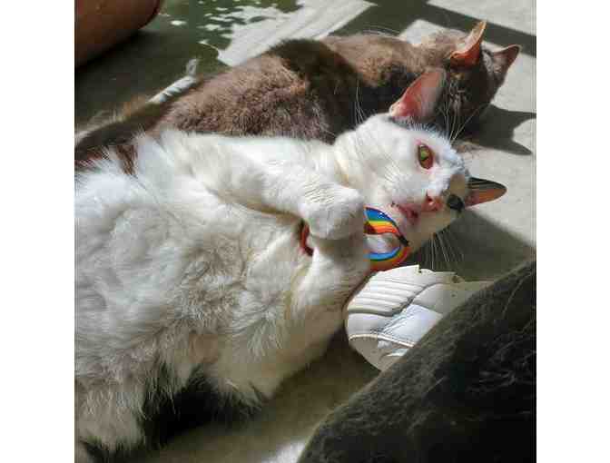 Virgo came to Rustic Hollow with his pal Wally. He is a very laid back kitty as you can see in the photo and he loves eating. He requests a donation towards two bags of IAMS dry cat food (their favorite). He sends his purrs and headbutts to the bidder who helps with this item donation.