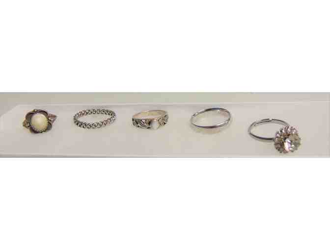 1 is adjustable; one is a sz 10 1/2 and marked .925 sterling silver; 1 is 7 3/4; 1 sz 10; and one size 4 1/2 (pinky ring perhaps?) Just a neat variety of rings.