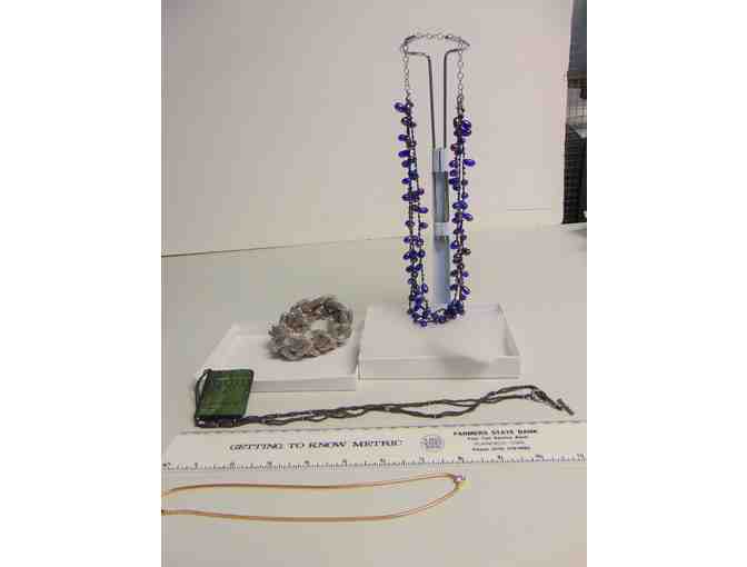 Three necklaces and one 2 1/2" Serpentine Link Bracelet (NOT expandable). Donated by Colette Helin.