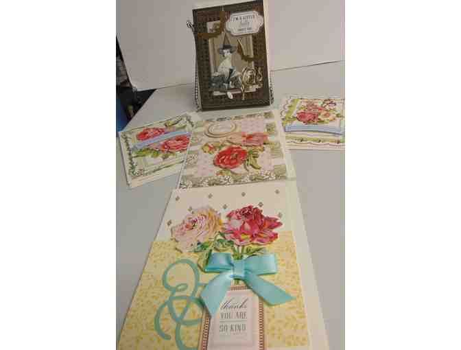 There are 3 birthday, one thank you and one cute halloween card in this assortment of five handcrafted greeting cards. Front cover has raised design. Really nice.