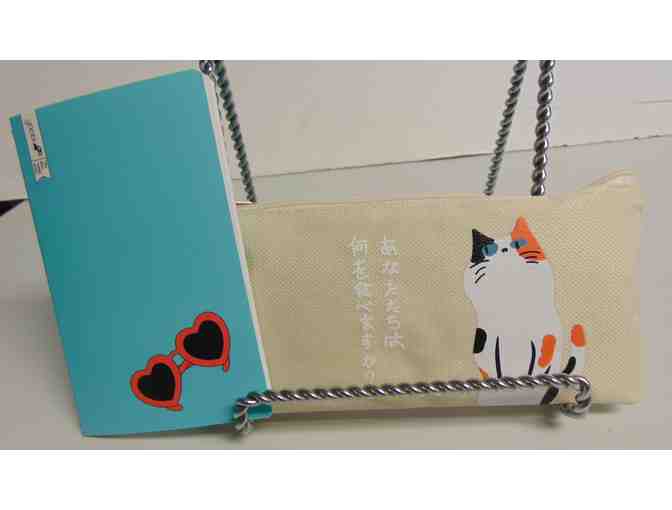 This pencil case includes: 1 notebook; 1 pen with cat head; 1 turquoise clip; 1 HoHo stick memo pad; 2 rolls paper tape (cats); and set of cat stickers.