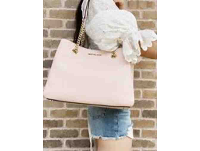 Michael Kors large LG Teagan chain long drop satchel. 100% genuine pebbled leather - Powder blush pink color - gold hardware - magnetic snap closure - fabric lined interior with 2 slip - 1 zip pocket - zippered divider compartment - chain and leather handles. Approximately 9" x 12" x 5.5" 10".