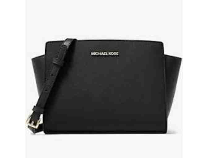 Michael Kors Selma Handbag. Soffiano leather - gold tone hardware - back zip pocket - front slip pocket- adjustable strap. Approximately 11.25 w x 6.5 h 4 d.