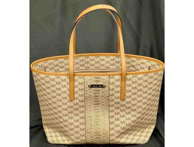 Michael Kors signature tote with gold snake print detail on the front. Several open inside pockets as well as a zip pocket, and an outer slit pocket on the bag. A fantastic find if you are a MK fan!
