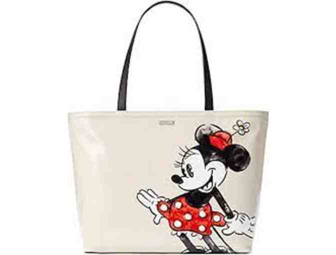 Limited Edition Kate Spade Minnie Mouse Tote -Saffianocross hatched fabric trimquick and curious lining -staple logo -Inside zipper pocket - Two additional pockets inside zipper closure-9” strap drop. Approximently 10.9"h x 12.9"w x 6.4"d