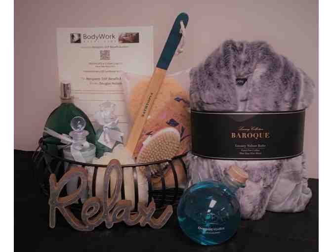 Gift Certificate for one hour massage from the BodyWork Associates, fluffy robe, assorted bath and spa products, copper bath shelf, bottle of Oceans Blue Vodka and relax sign