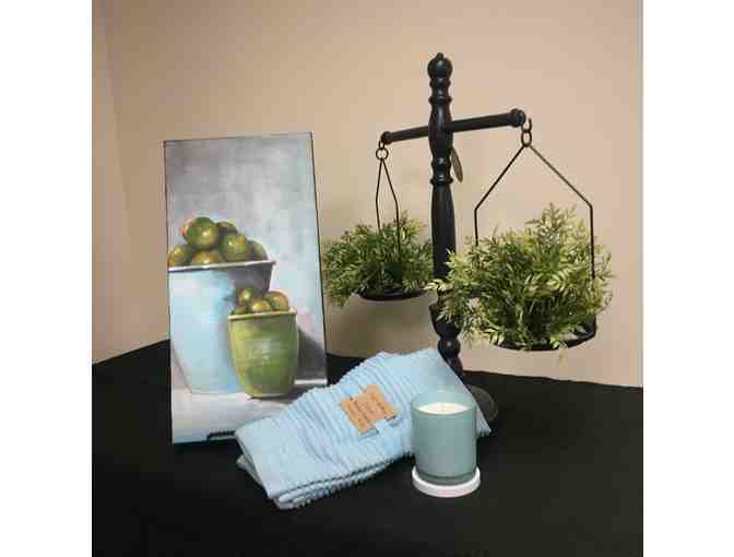 Original painting by Barb Frasca, farmhouse scale, fern pods, blue candle and kitchen towels