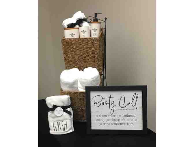 Wicker towel holder, white bath and hand towels, washclothes, Rae Dunn accessories (soap despenser, tooth brush holder and cup) and Booty Call bathroom print