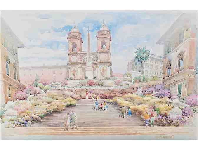 Framed Serigraph signed by Fernando Neri (F. Neri) in prestine condition. Features the 'Trinta dei Monti', a Catholic church from the late Renaissance era, best known for its commanding position over the Spanish Steps which lead down to the Piazza di Spagna in Rome.