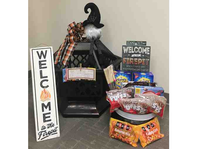 Firepit, wood, and smore fixin's in farmhouse tray, witch gnome, two welcome firepit signs, candy corn and Halloween bow