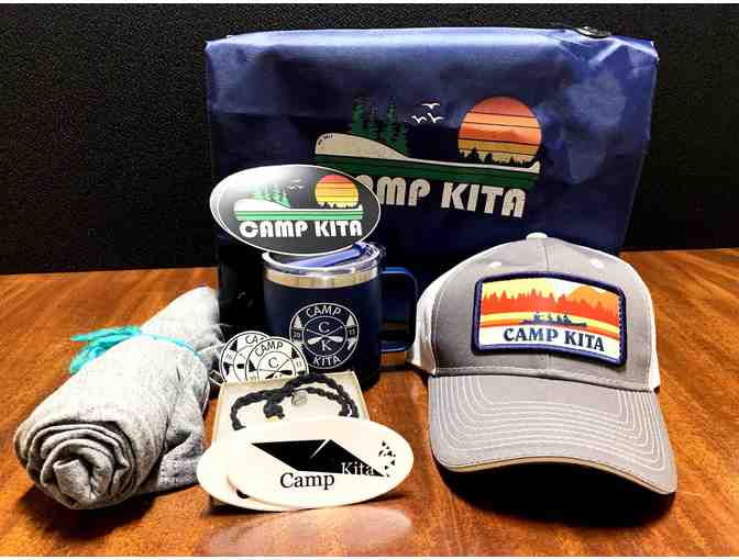 Auction Item: Camp Kita Swag that includes a shirt, hat, mug, bag and stickers