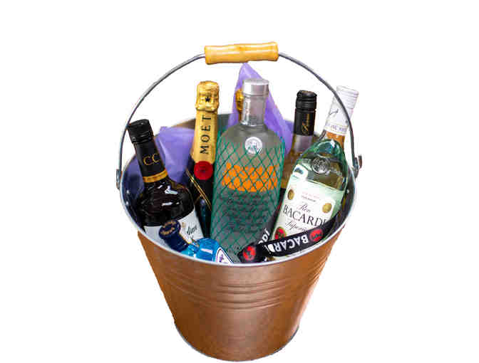 A selection of wine (red, white & sparkling white) and spirits (rum, rye, and gin). Presented in a galvanized bucket. A selection of mini liquor chocolates is also included.