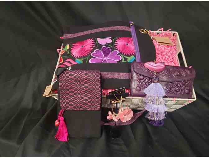Includes: Large Floral Embroidered Clutch -Small handmade clutch for phone or wallet -Beautiful leather wallet with mirror -Purple and pink lips keychain - Yeyetsi pink earrings -Reusable cloth basket for storage.