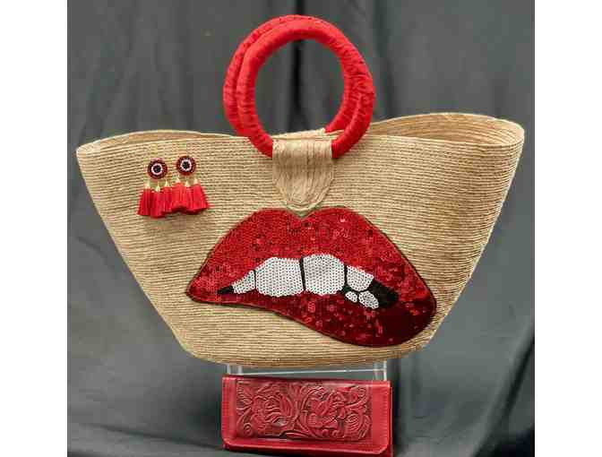 Includes: Beaded lip beach tote – handwoven -One red leather wallet with rose pattern and mirror -One pair of red Aztec earrings.