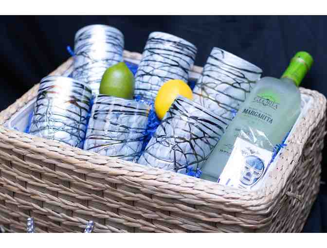 Inclueds: (6) hand blown confetti and web glasses v- Rancho La Gloria ready to drink Margarita cocktail mix - (1)  MexiPop Art Design bottle opener - (1) woven guest basket.