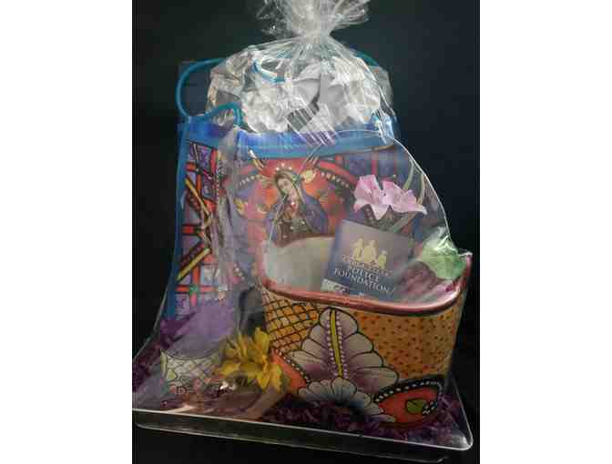 Includes: Talavera pot -Talavera watering can pot -Virgen de Guadalupe necklace - Virgin Mary tote