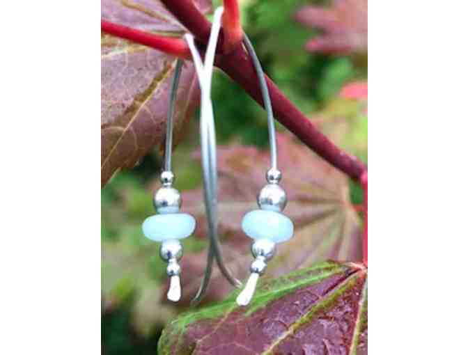 One pair of earrings featuring sterling throughout. The pale blue-green tones of semiprecious Amazonite stone beads are offset by a small and larger silver bead on each side of the stone.