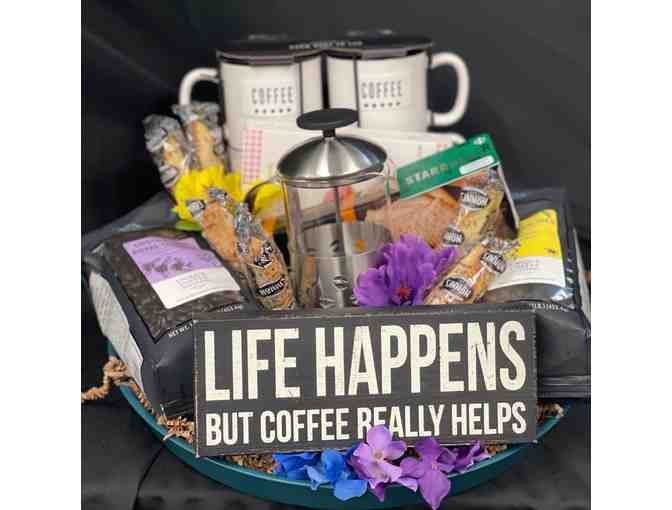 Includes: $50 Starbucks - Jamaican Joes whole bean coffee - Costa Rican Royal Tarrazu whole bean coffee - 4 coffee cups in coffee holder -French coffee press - Life happens sign - 1 coffee serving tray and more.