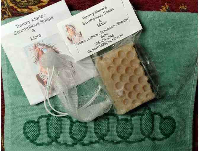 Delicately embroidered guest towel with Tammy Marie’s Scrumptious Soaps gift set.