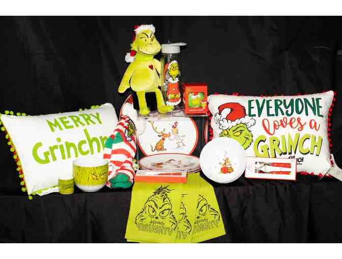 Includes: 2 quirky Grinch pillows - 2 Grinch “Naughty” dishtowels - 4 kids dishes - 4 kids bowls - Grinch toothpick holder - Grinch mug - One Grinch thermos - 2 sets of rinch Utensils - 1 Grinch Christmas Bauble - 2 Grinch Christmas stockings -1 Grinch stuffed animal -1 Cat in the Hat stuffed animal.