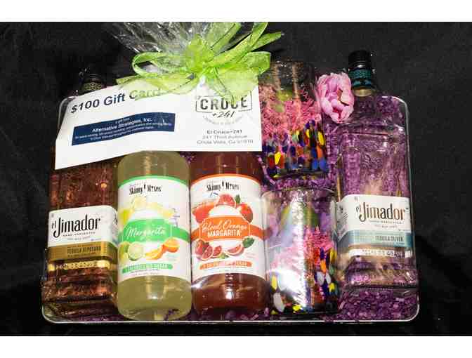 Includes: $100 gift card to El Cruce +24 - El Jimador Tequila Reposado - El Jimador Tequila Silver - Skinny Girl Mixes Margarita - Skinny Girl Mixes Blood Orange Margarita - 2 multicolor glasses - Silver serving tray