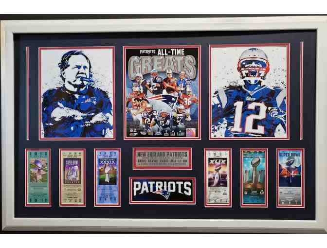 Auction Item: New England Patriots 6 Time Super Bowl Champion Replica Ticket Collage Framed Photo. White Frame 24 inches by 36 inches. Shipping is included within the continental United States. Does not include AK or HI.