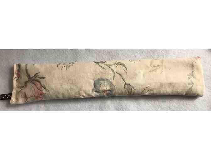 This is a corn bag filled with deer corn which will not pop like popcorn. When it is heated it will emit a moist heat that is good on achy and sore muscles. It is also good on cold evenings to warm up a cold bed when put at your feet.