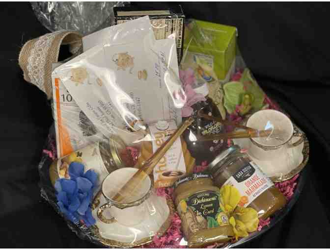 Includes: Two $25 gift cards to My Cup of Tea Unique Gifts ($50) - 2 white and cold teacups - Wild raw wildflower honey - Dickinson’s lemon curd - Agriscilia Sicilian lemon with ginger marmalade - Casasicilia orange marmalade - Yogi bedtime tea - Coffee Bean mint tea - Stash Chai Spice tea - Loose leaf earl grey tea - Loose leaf winter cherry tea - Tea bags - Honey pot