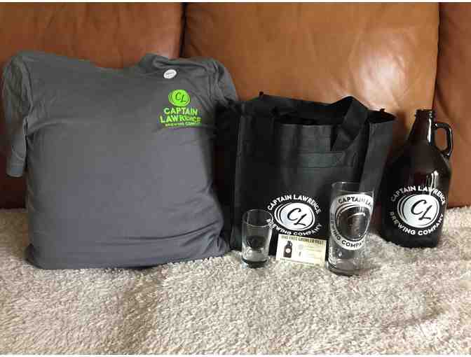Enjoy a gift bag from Captain Lawrence Brewing Company which includes a growler bag, 64oz growler with free fill card, pint glass, taster glass, sticker, keychain, and t-shirt.