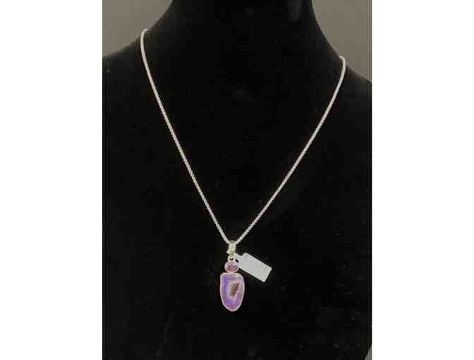 This gorgeous item features a natural piece of Amethyst Agate which has been set in Sterling Silver and crafted into a pendant with chain.