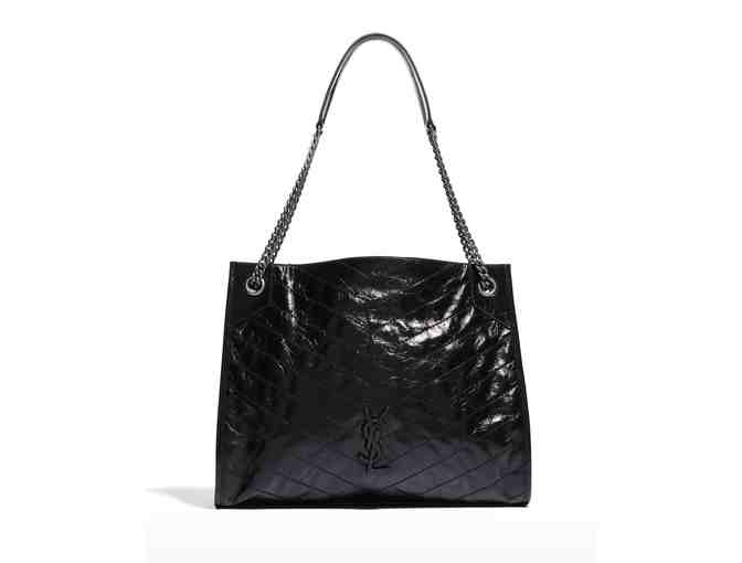 Complete your wardrobe and make a statement with a Saint Laurent Niki YSL Monogram Leather Shopping Tote Bag.