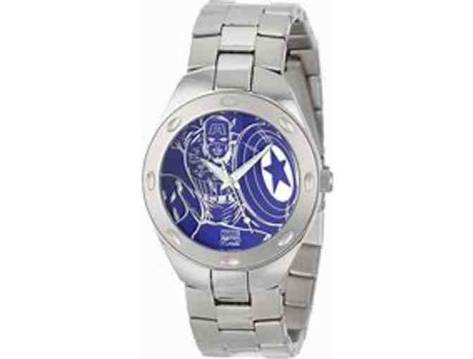 This is for all you Marvel fans! Marvel Men's Captain America watch, Metal Case and Blue dial, Stainless Steel Fortaleza Bracelet, Accurate Japanese quartz movement with analog display. Scratch Resistant Mineral Crystal.