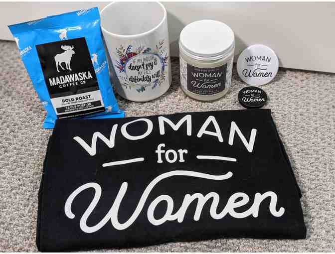 This gift package supports the Woman for Women initiative in Pembroke, ON, supporting women in business. It includes a t-shirt (size m), mug and coffee, scented candle and more