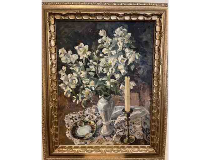 This work is hand painted oil on canvas by a well-known local artist in Saratov, Russia circa 1995. The still life is jasmine, a china plate and a candle.