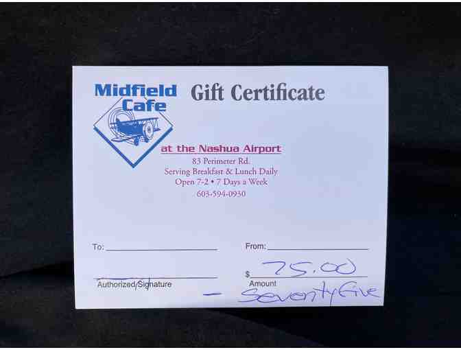 $75 Gift certificate to the Midfield Cafe at Boire Field in Nashua, NH. Have breakfast or lunch and watch the planes take off at this Nashua favorite spot!