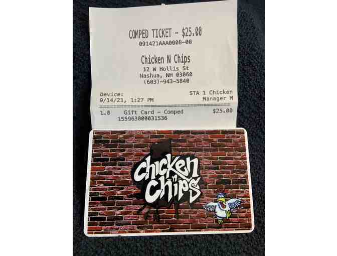 $25.00 Gift Card for Chicken N Chips located in Downtown Nashua, NH. A local favorite, it's all about the chicken! Crispy outside, jucy inside and bursting with flavor!
