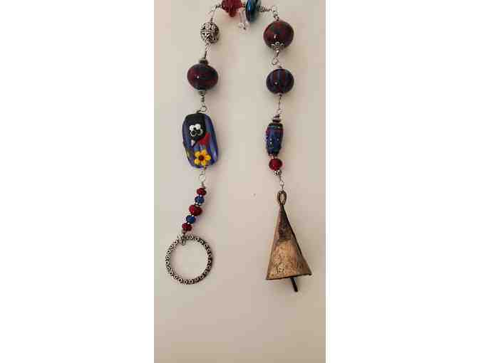 This is aprox 17" and new. Features a tuxedo styled cat with a copper bell at bottom with blue/burgandy toned beads