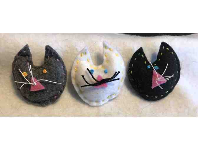 This trio of cat toys look like little kitty faces. These look to be made by hand but we don't know by whom. Your kitties are sure to love tossing them around.