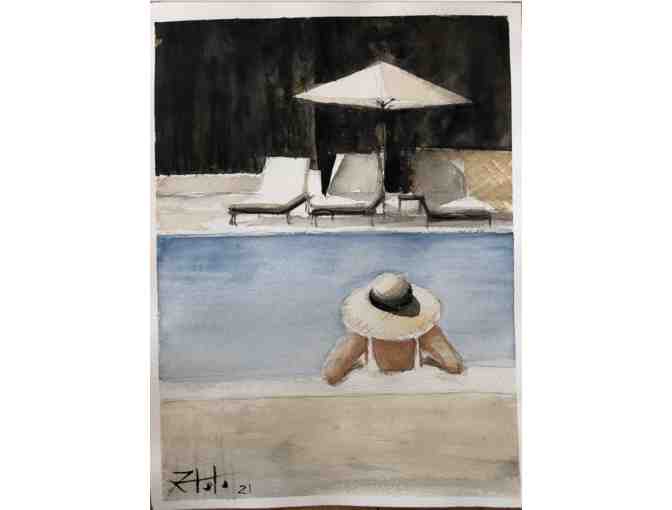 Each of his two pieces in the Pool Time Collection are watercolor on paper, measures 18"x22" and is framed under glass with a white frame and mat. Purchase one to stand out or several to create a wall of inspiration in your home or office.